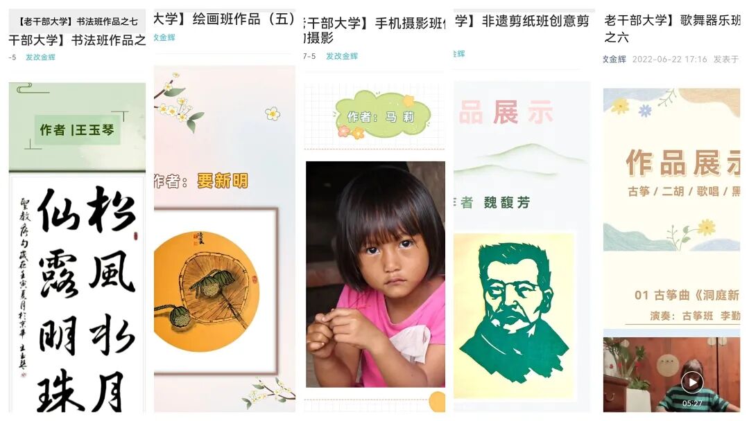 作业交流云展按照本学年开设的课程门类,分为手机摄影、非遗剪纸、书法、绘画、歌舞器乐等五大系列在微信公众号“发改金辉”上以专栏形式展出。自活动开展以来,学员们积极参与,他们课上认真听老师授业解惑,课下反复回课练习,用心创作了一幅幅、一件件精美的作品。随着活动深入开展,热度持续攀升,作业展示逐渐成为老同志们的精神盛宴和文化大餐,每日“追更”。活动共收到学员作品1500余幅(件),编发公众号40期,其中手机摄影系列12期、非遗剪纸系列10期、书法系列7期、绘画系列5期、歌舞器乐系列6期,浏览量再创新高。学员们对活动高度认可,有的老同志说:“作业云展形式非常契合我们的需求,对促进老有所学起到了非常好的作用,也让学友们相互学习、互相鼓励,老干部大学越办越好、越办越活了!”有的老同志说:“非常感谢离退休干部局搭建平台,感谢工作人员用心编辑作品,充分展现老同志的学习风采,让我们学有所成、学有所乐,期待新学期有更多收获。”