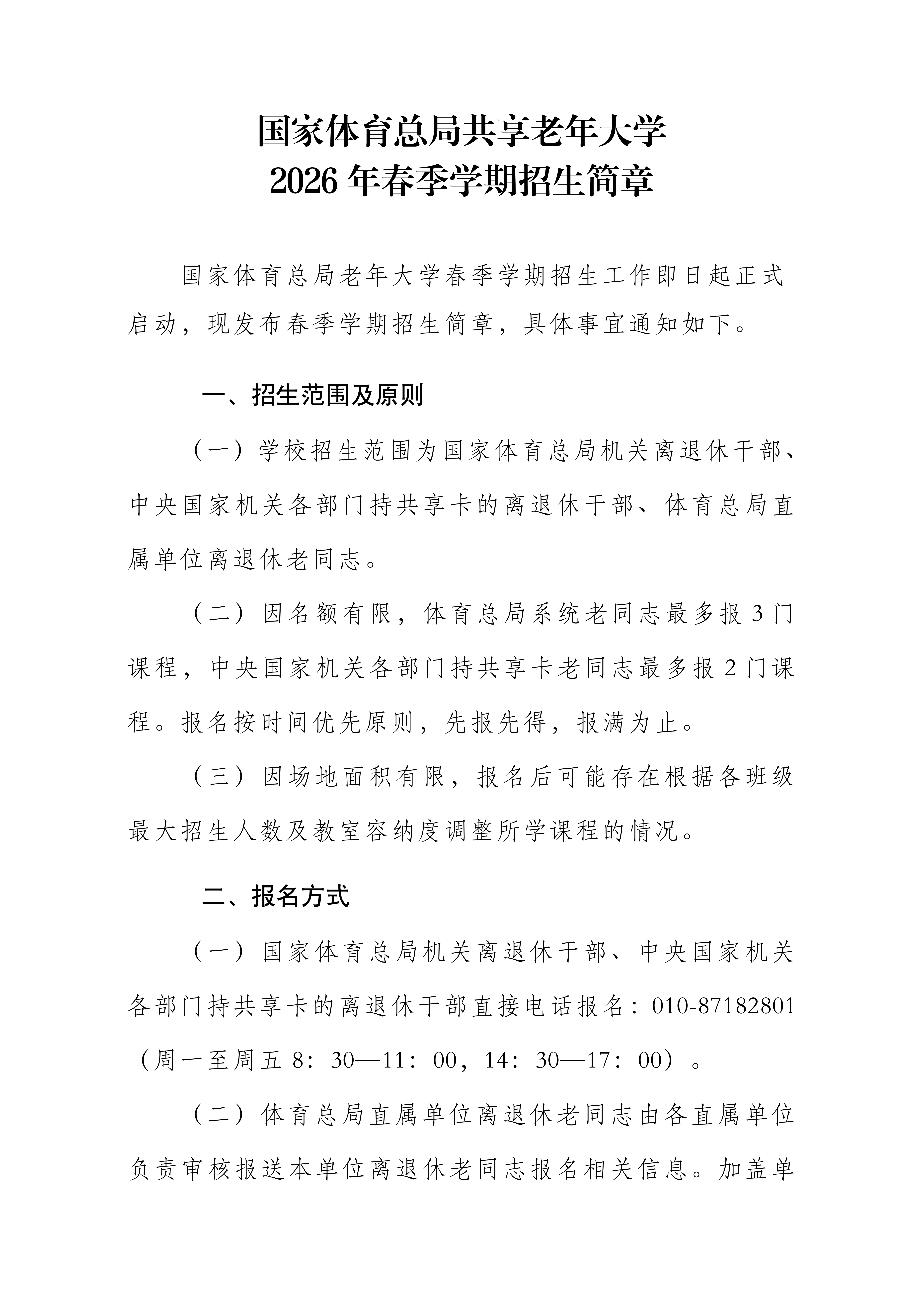 国家发展改革委老干部大学2026学年即将开学,经校委会研究决定,本学年采取线上和线下结合的教学方式,面向我委离退休干部和中央国家机关各部门持共享卡的离退休干部招生,招生事宜通知如下。 开学时间 2026年3月2日(星期一) 授课模式 线下课在三里河北街三号院甲2号楼和8号楼进行教学,线上课继续在“桑榆金辉云课堂”和“睦课伴读”2个平台上开展线上教学,共开设19门课程。 线下12门课程 ...