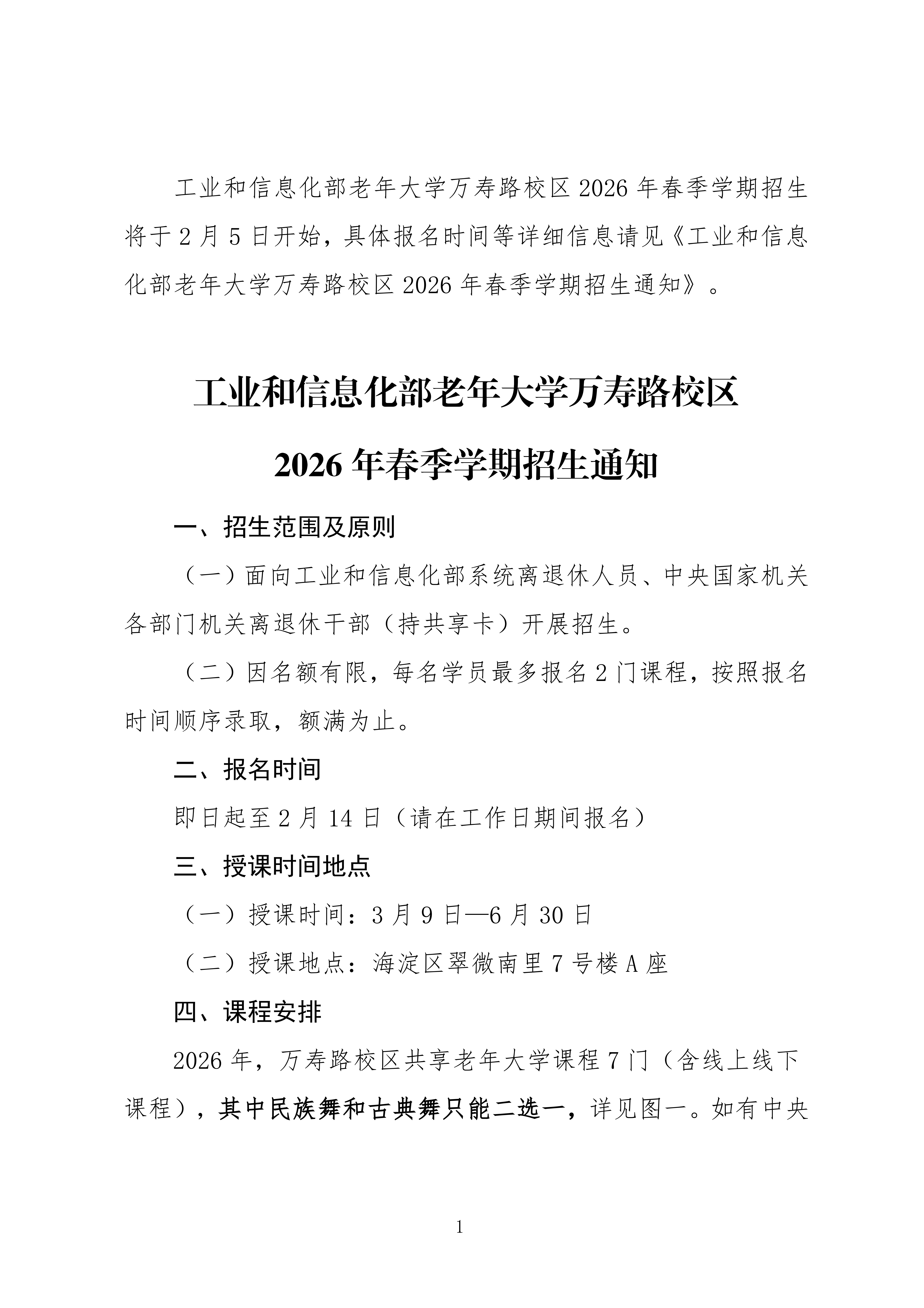 01 招生范围 水利系统离退休人员、中央国家机关各部委及社会各界离退休人员。 02 课程安排 春季学期课程从2026年3月2日开始,每周授课一次,共计16次课。 上课时间:上午9:30—11:00;下午14:00—15:30。 各班报名人数不足开班名额(20人)时则缓办。 03 注册方式 打开微信中的“发现-小程序”,搜索“水利部老年大学”即可,或打开微信扫描下方二维码。 注:扫 ...